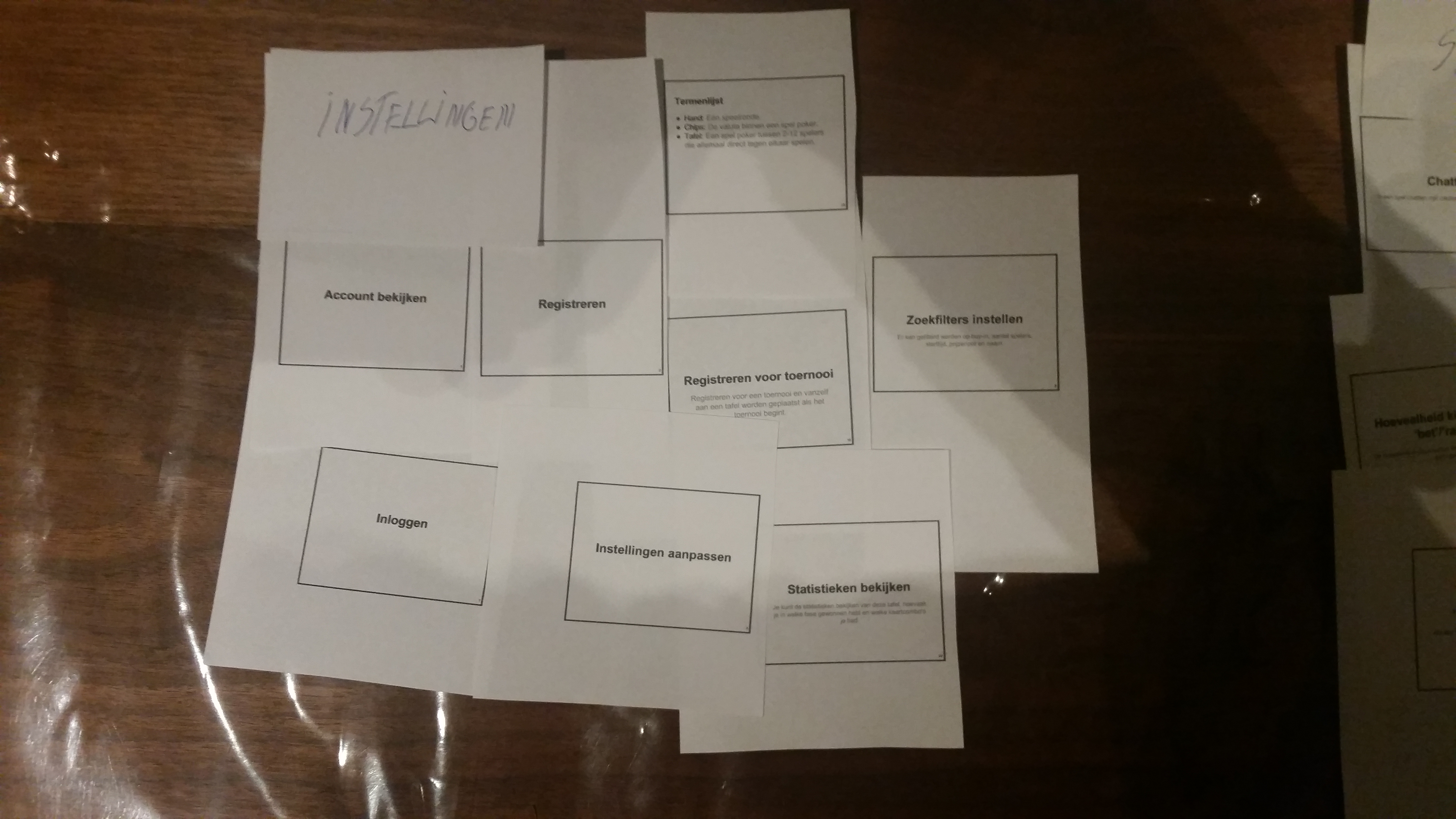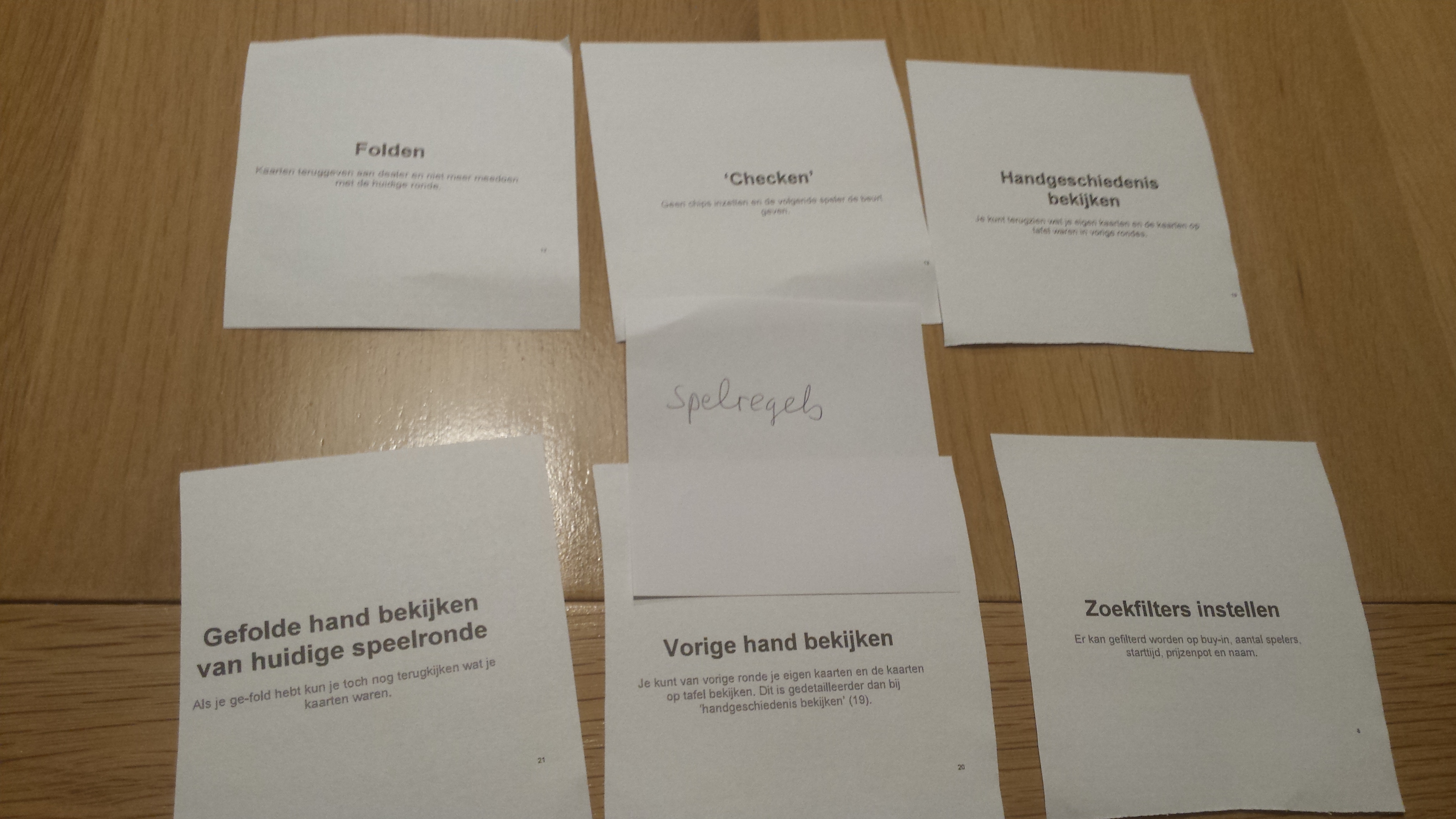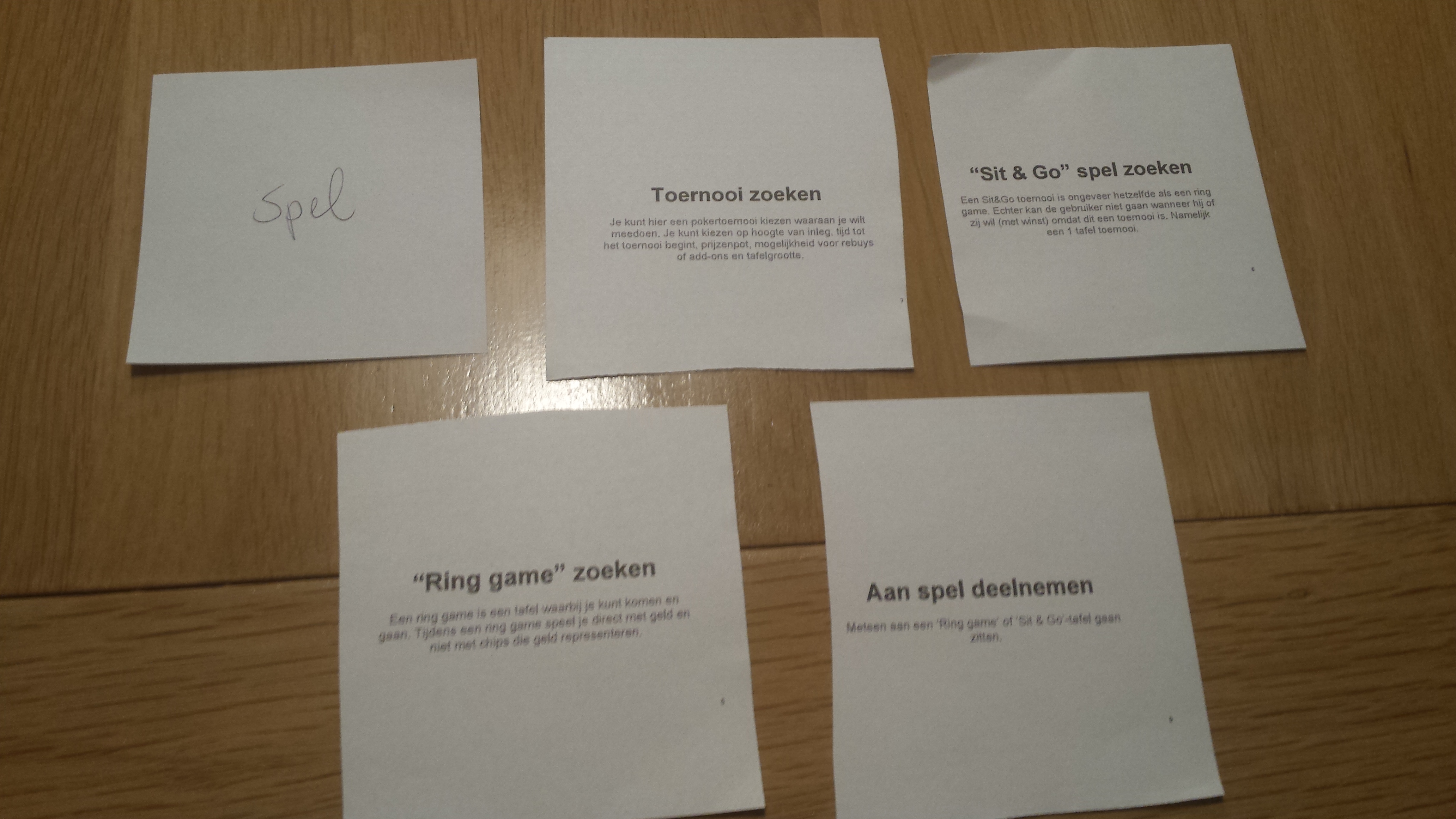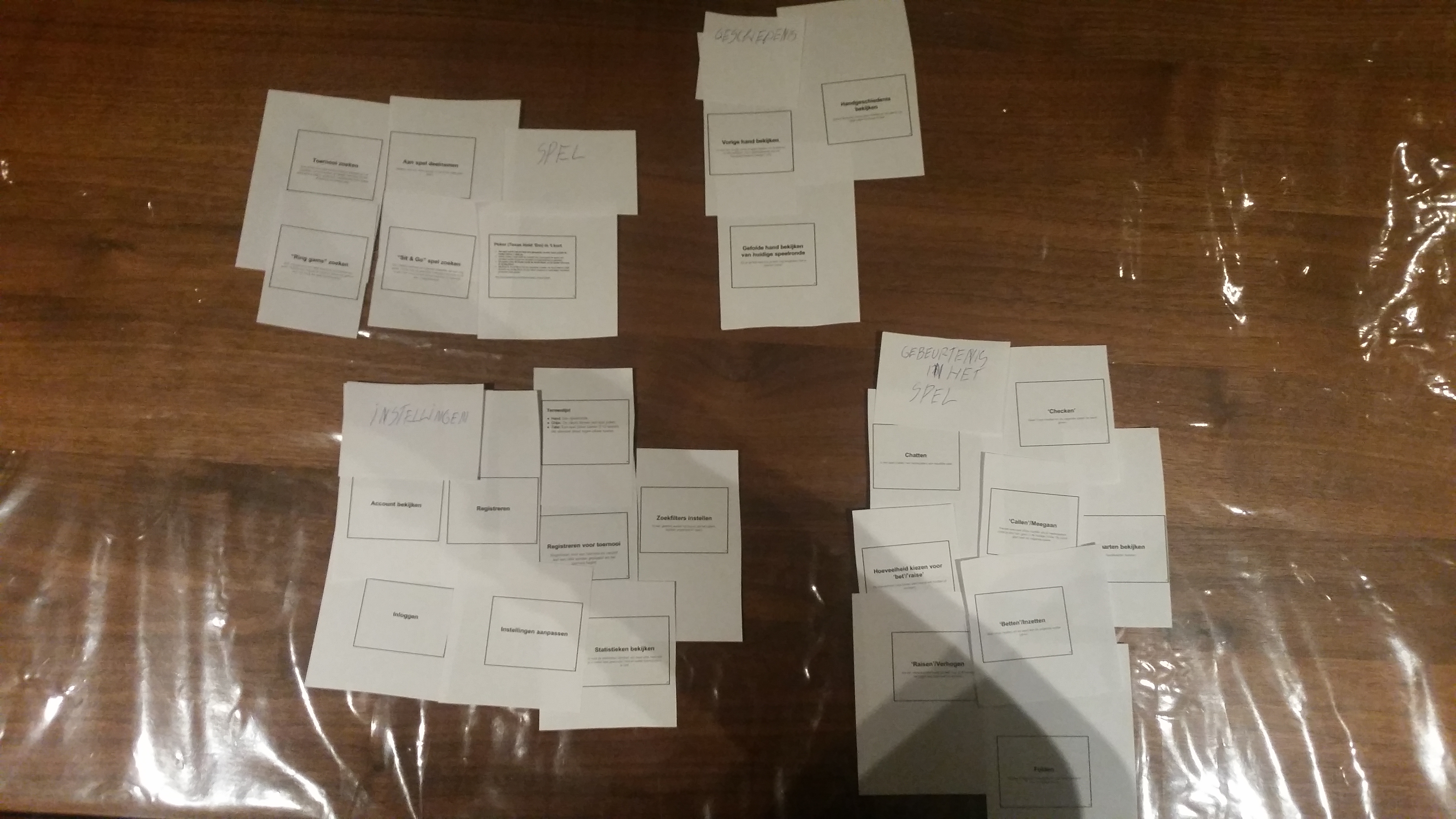 We hebben besloten alle resultaten van de card sorting tests en onze initiële insteek samen te voegen als één resultaat. Alle gebruikers hebben een kopje “Instellingen” gemaakt, welke wij niet hadden bedacht. Dit brengt wat meer onderscheid aan tussen functiegroepen en functies in het algemeen. Ook hebben de gebruikers de functie “Gefolde hand bekijken van huidige speelronde” onderverdeeld bij “Geschiedenis” waar wij deze bij “Spel spelen” hadden gezet. Voor het grootste deel en vooral bij de hoofd functies komen de resultaten van de gebruikers met de resultaten van ons overeen. We hebben nu een beter inzicht in wat de gebruiker verwacht van bepaalde functies en hoe hij deze zo natuurlijk mogelijk voor ogen heeft.