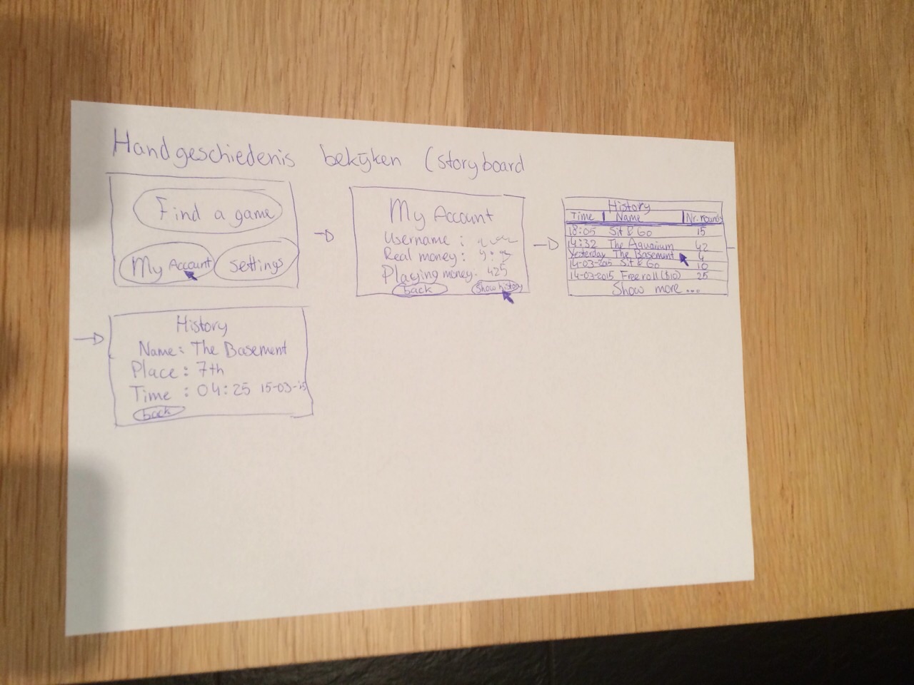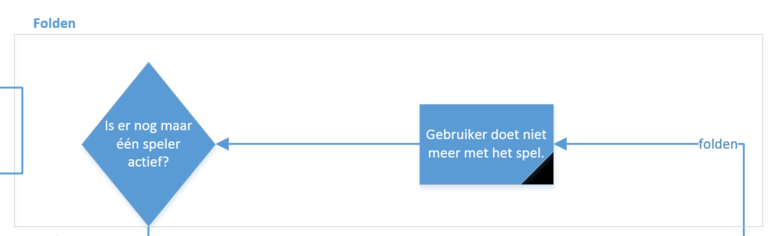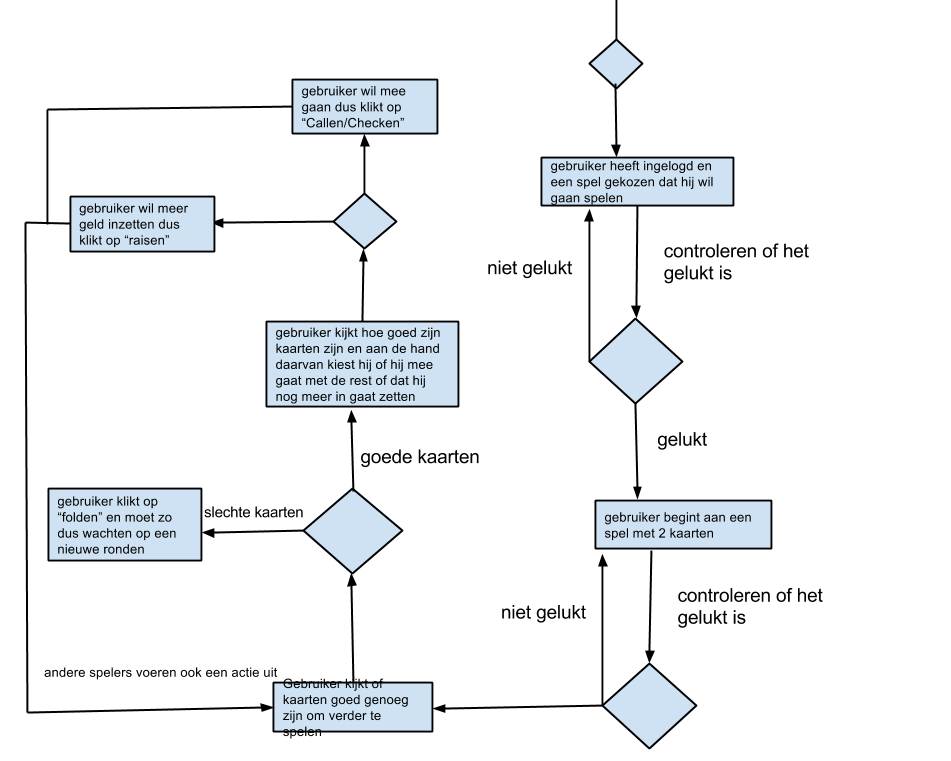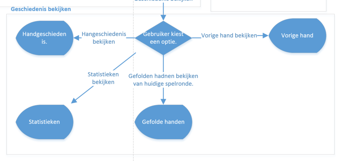 flowchart-geschiedenisAls laatste heeft de gebruiker de mogelijkheid om geschiedenis te bekijken binnen het spel. Zo kan hij zijn vorige hand nog eens bekijken, zodat hij weet of hij wel of niet terecht heeft gefold. Ook kan hij de kaarten bekijken van de medespelers die gefold hebben. Ook kan hij gedetailleerd de handgeschiedenis kijken van zichzelf en de andere spelers.