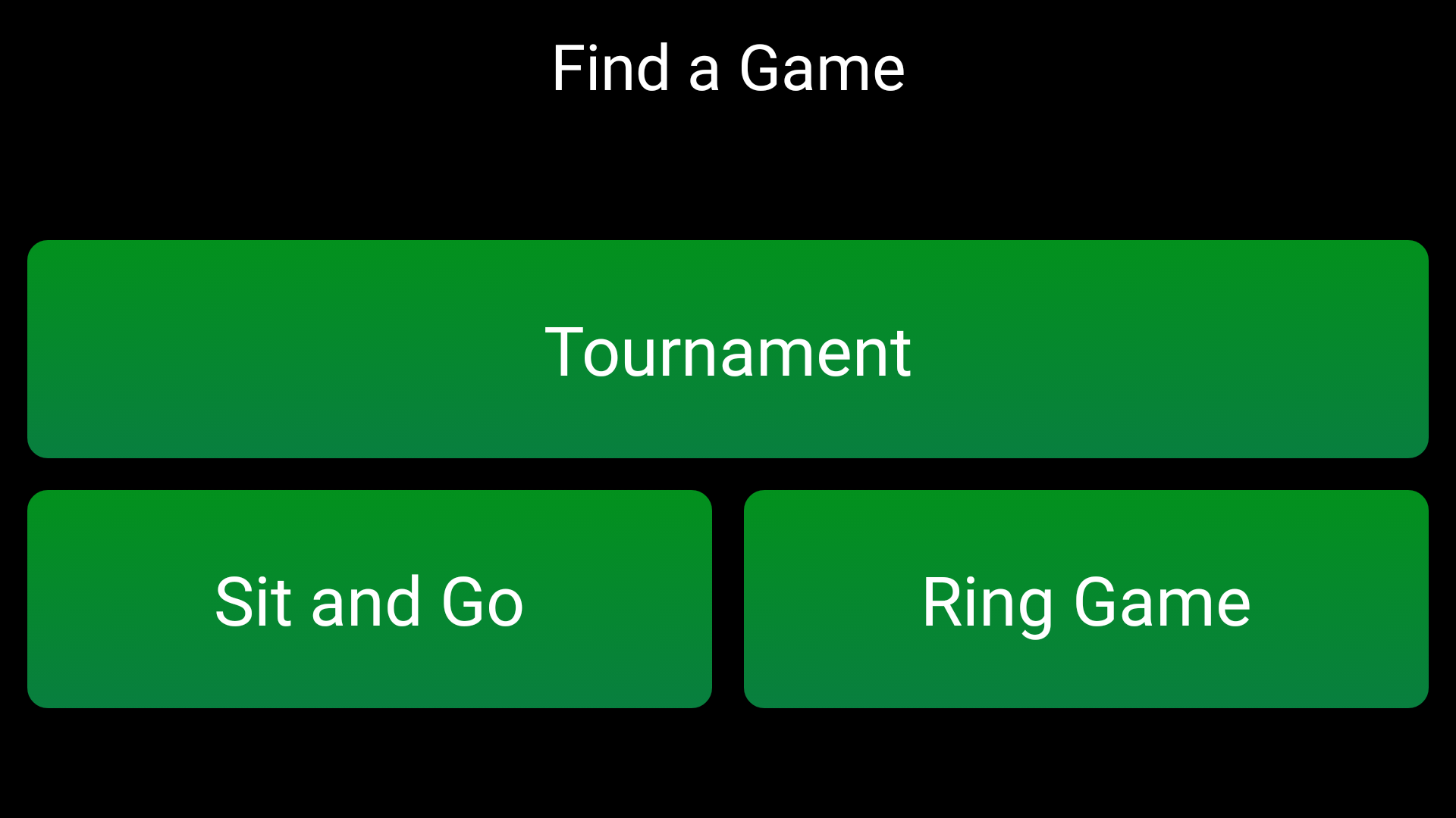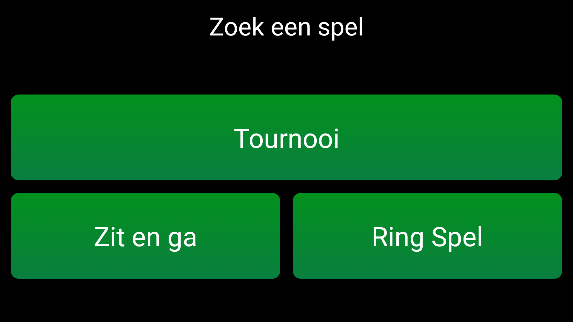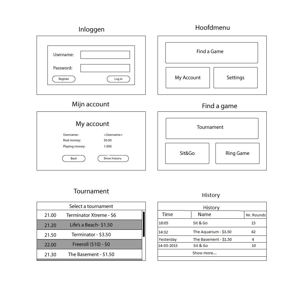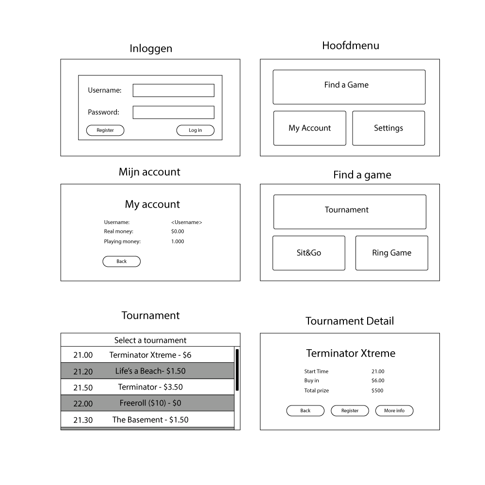 Vanuit het hoofdmenu kan de gebruiker kiezen voor de optie ‘Spel zoeken’. Vervolgens heeft hij de keuze uit de verschillende spelvormen: ring game, sit & go en toernooi. Wanneer de gebruiker een spelvorm heeft aangeklikt, krijgt hij een overzicht met de spellen/tafels die binnen de categorie vallen.