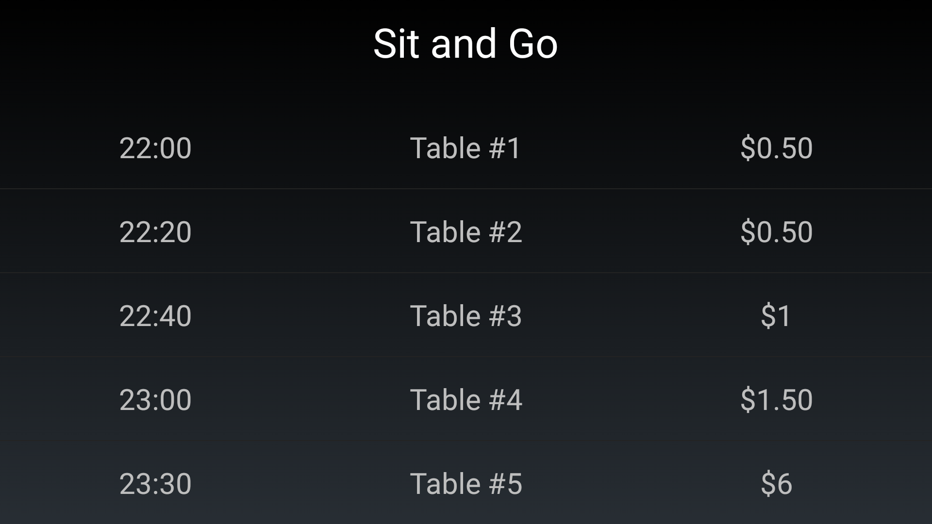 Wanneer een gebruiker een spelvorm heeft aangeklikt, krijgt hij een groot overzicht met allemaal verschillende tafels/spellen. Om makkelijker een geschikt spel te vinden, kan hij zoekfilters instellen. Er kan gefilterd worden op buy-in, aantal spelers, starttijd, prijzenpot en naam.